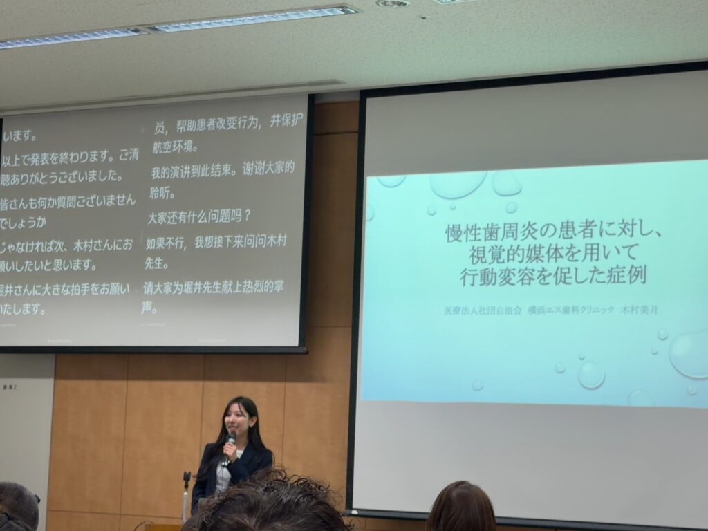 日々の診療で培った経験や、患者様の健康を支える取り組みをまとめ、全国の歯科医療従事者に向けて多くの参加者の前でも落ち着いて発表し、堂々とした姿勢で発表に臨む姿が印象的でした。
